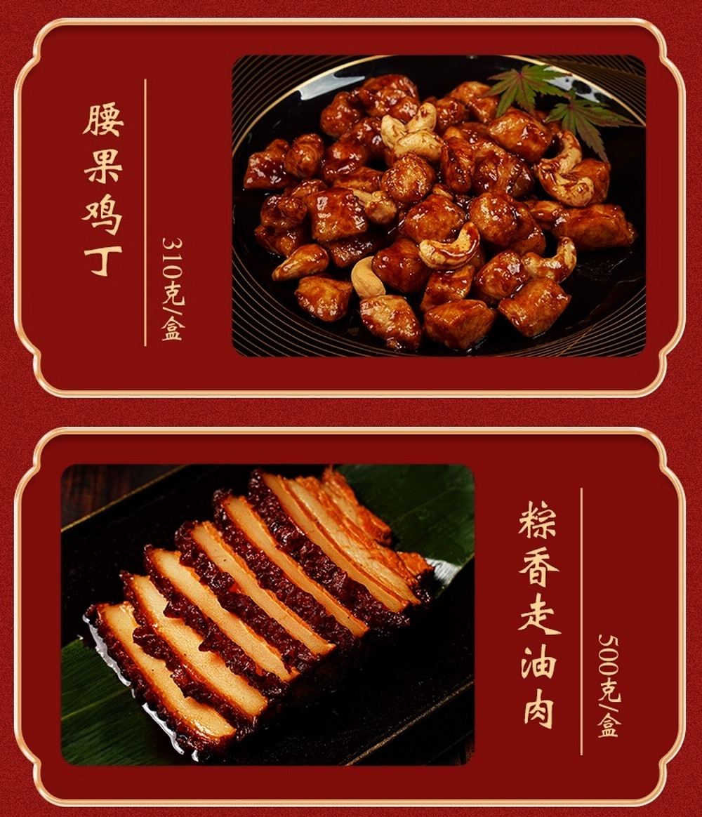 西域香煎羊排 310g 清炒河虾仁230g 腰果鸡丁(国际饭店联名款)310g 家乡笋干走油肉500g 八宝辣酱700g 本帮烩三鲜480 g 黑椒西冷牛肉粒260g 鸡油蒸鲥鱼760g 锦味土鸡汤2000g 糯米八宝饭500g 三丝春卷300g 酒酿小圆子400g ¥ 898元 加微信咨询订购