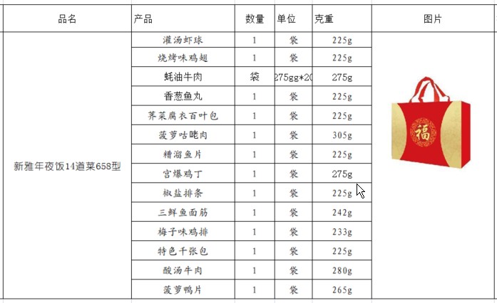 灌汤虾球 1 袋 225g 烧烤味鸡翅 1 袋 225g 香酥小牛排 1 袋 225g 菠萝鸭片 1 袋 265g 宫爆鸡丁 1 袋 275g 酸汤牛肉 1 袋 470g 酸菜溜鱼片 1 袋 325g 梅子味鸡排 1 袋 233g 三鲜鱼面筋 1 袋 242g 香菇狮子头 1 袋 225g ¥ 488元 加微信咨询订购